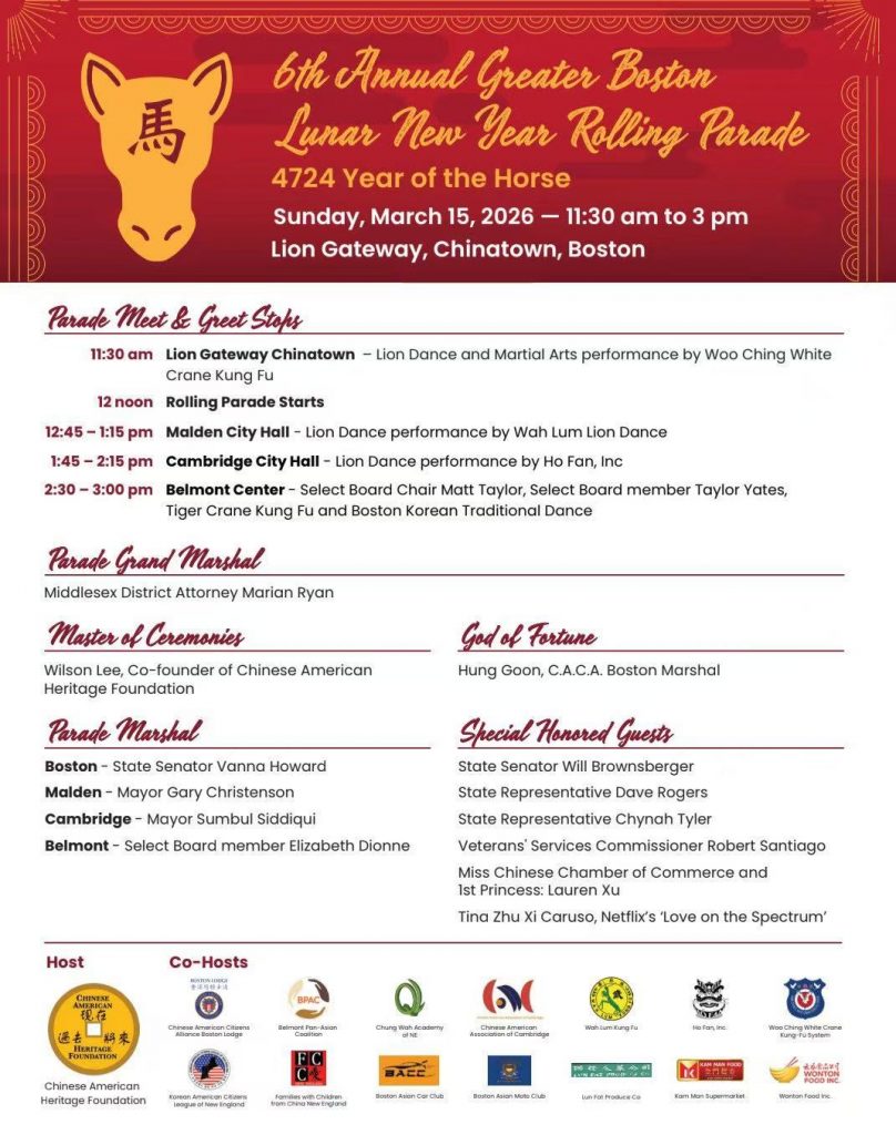 Join us for the 6th Annual Greater Boston Lunar New Year Rolling Parade! Celebrate the Year of the Horse with us on Sunday, March 15, 2026. This special stop for Cambridge residents will feature a lion dance by Ho Fan, Inc. and a New Year blessing from Mayor Sumbul Siddiqui.